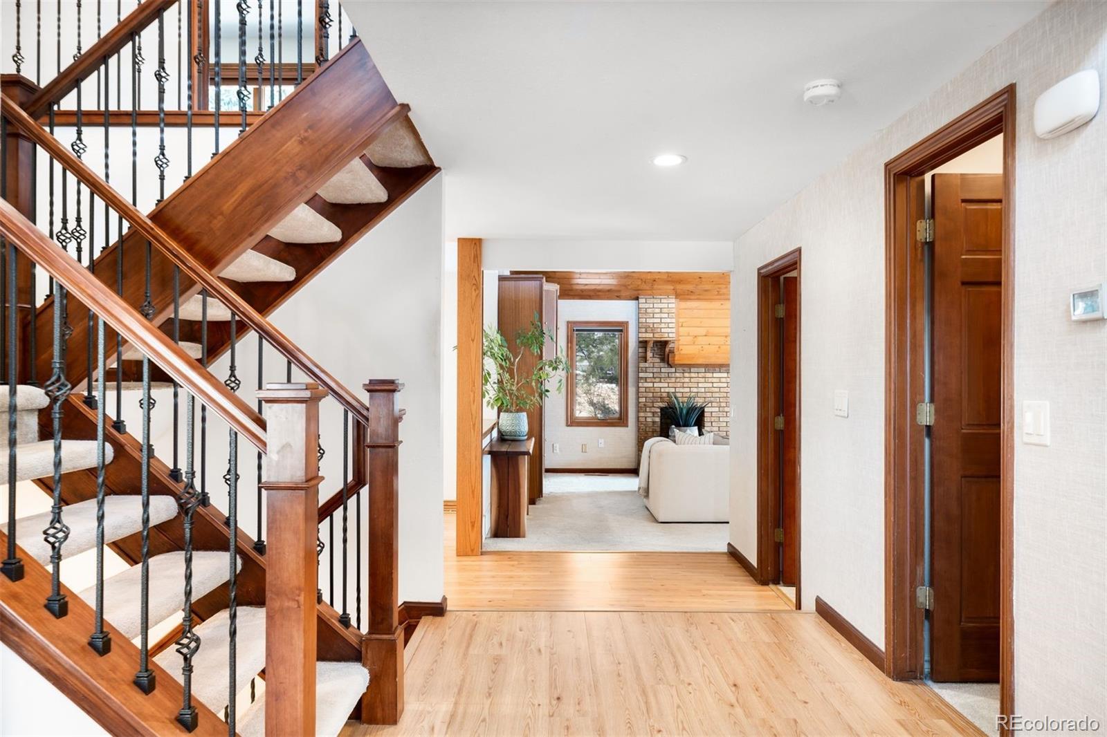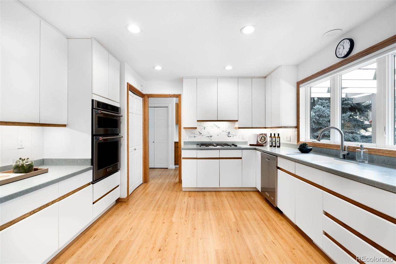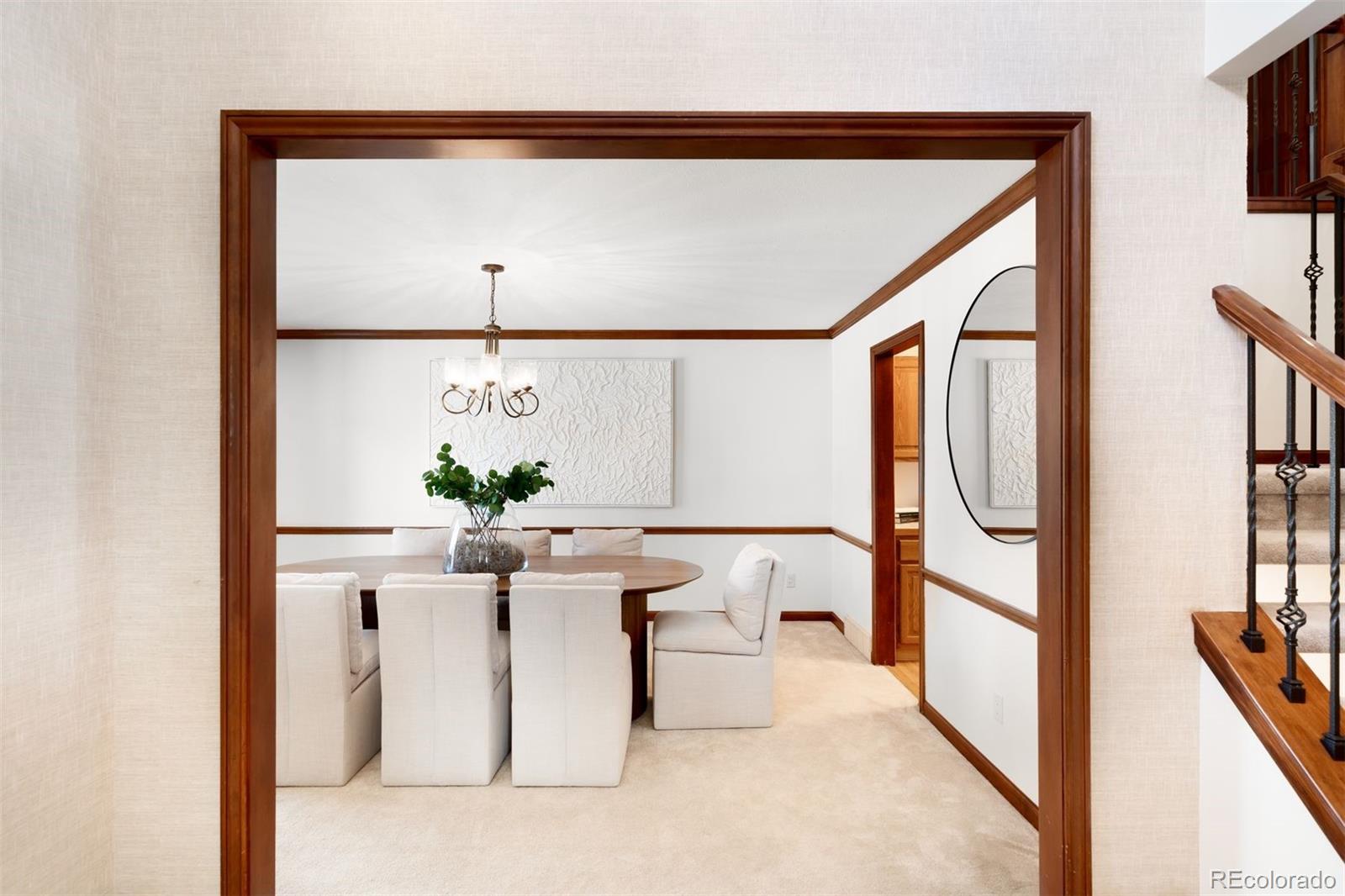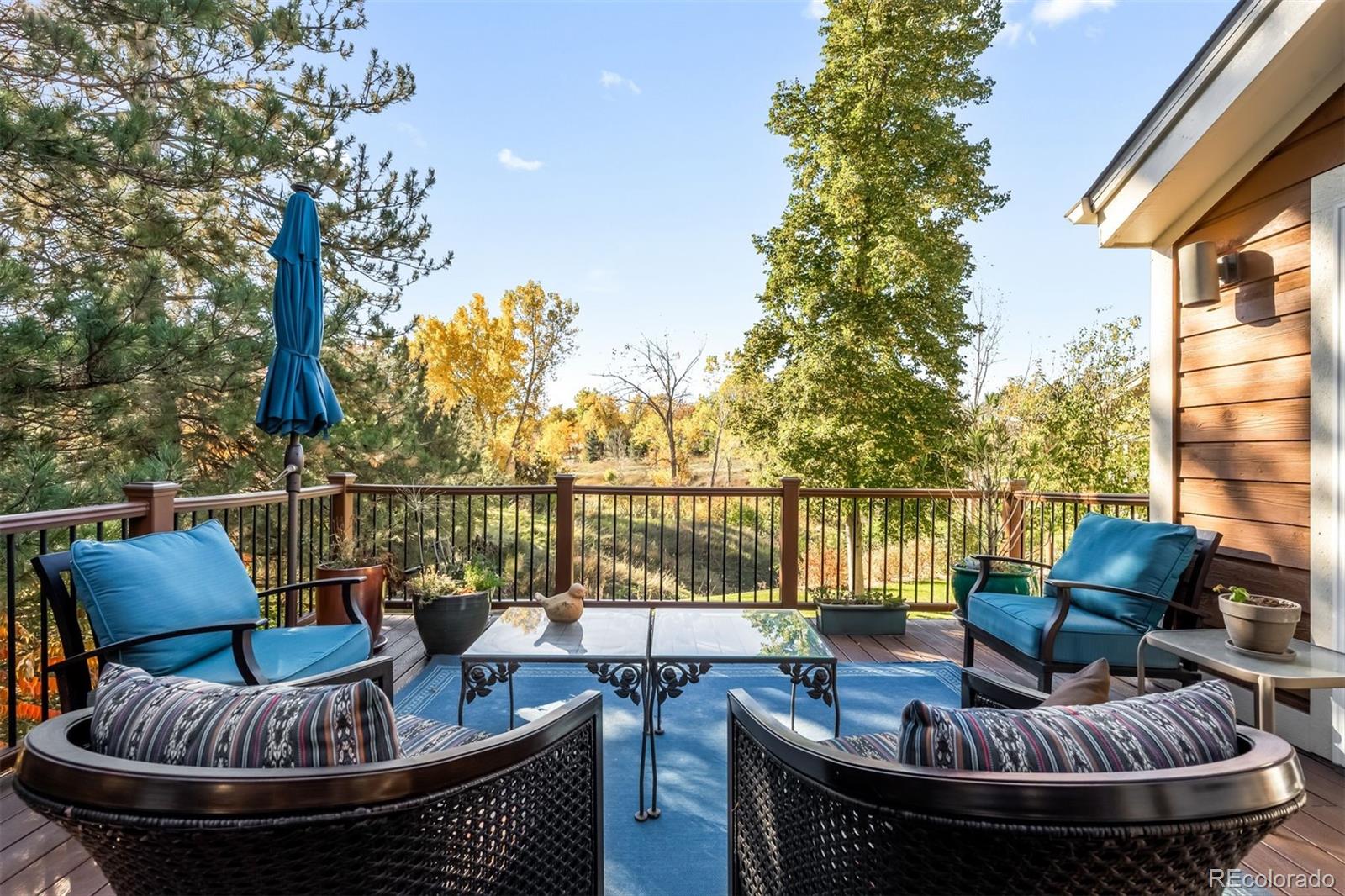 Set at the end of a quiet cul-de-sac backing to Lee Gulch and its integrated trail system, 1920 W. Arapahoe Road is surrounded by mature pines, offering a private setting with frequent wildlife sightings just minutes from downtown Littleton. Inside, generous proportions and natural light define the home, with large windows framing views of the surrounding landscape. Adjacent to the entry, the living and dining rooms create a welcoming sense of arrival, with the family room flowing into an office flanked by custom built-ins. Positioned just off the main living spaces, the kitchen connects to the dining room through a butler's pantry and opens to the family room, with both spaces offering direct access to two outdoor areas and the private, fully fenced backyard, creating an ideal layout for everyday living and entertaining. The family room, complete with a wet bar and gas fireplace, leads into the paneled sunroom and deck, extending the living space with views of Lee Gulch and its trails. Upstairs, the primary suite is spacious and well-appointed, featuring a five-piece bath and a walk-in closet. Three additional bedrooms and two full bathrooms complete the upper level, offering flexibility for family, guests, or work-from-home needs. The garden-level basement features a rec room with a fireplace, a three-quarter bathroom, and a fifth bedroom suited for guests, an office, or a fitness space. An expansive three-car garage completes the property, offering a rare opportunity to enjoy privacy and nature in the Lower Ridge neighborhood within minutes of downtown Littleton and its restaurants, boutiques, and coffee shops.