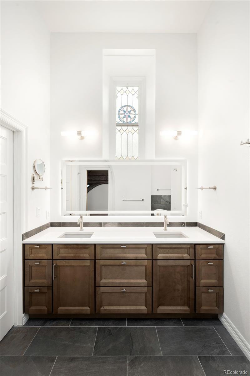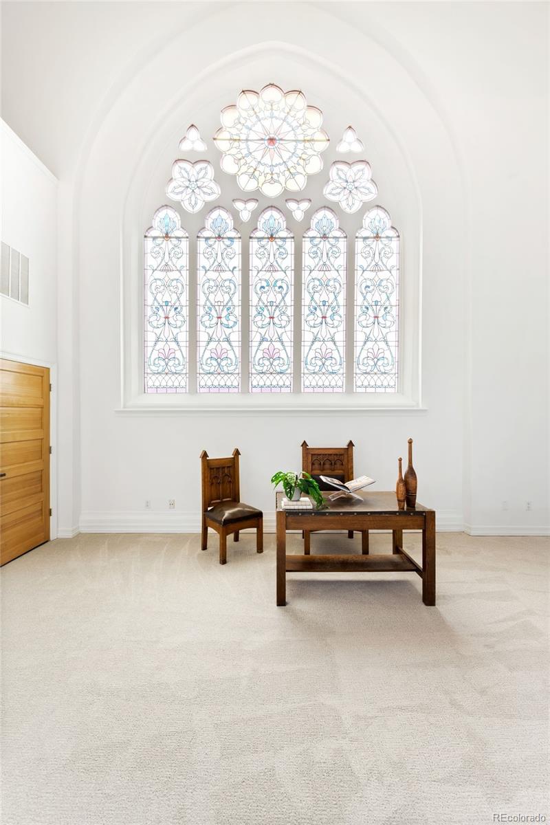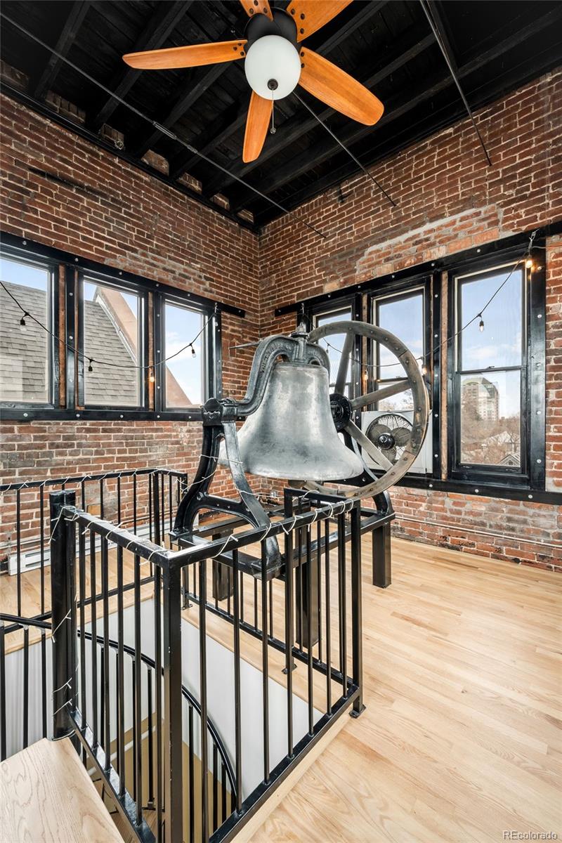 A rare opportunity to live in an iconic property. Long before Broadway became one of Denver's most vibrant corridors, the Bell Tower Lofts stood as a neighborhood landmark. Built in the 1890s and thoughtfully reimagined in the early 2000s into just eight distinctive residences, this storied building offers a rare opportunity to live within a piece of Denver history that feels both intimate and iconic. Unit 8 lives like a private townhouse, with no neighbors above or below, offering a level of privacy seldom found in urban living. Inside, cathedral ceilings soar overhead as oversized windows and original stained glass flood the space with natural light. Refinished hardwood floors and custom woodwork echo the building's rich past, while the living room is anchored by a gas fireplace and nearly 32-foot ceilings that create a striking sense of volume and openness. The kitchen opens seamlessly to the main living areas, designed for both everyday living and effortless entertaining. Granite countertops, ample cabinetry, and a functional island balance style and utility. On the main level, a true bedroom with a built-in Murphy bed and en-suite full bath is complemented by a separate laundry room. A second conforming bedroom offers flexibility as a dining room or home office and opens directly to a private side patio, creating a rare indoor-outdoor connection. Upstairs, the primary suite serves as a serene retreat with vaulted ceilings, abundant natural light, and a spa-inspired five-piece bath. Above it all, and accessible only from this residence, the third-level bell tower stands as a truly singular feature. Exposed brick, industrial detailing, and sweeping 360-degree views of downtown Denver and the mountains complete this unforgettable architectural space. Two deeded parking spaces and a deeded storage unit offer everyday ease, while Denver's most beloved restaurants, Washington Park, Cherry Creek, and downtown are all just outside your door.