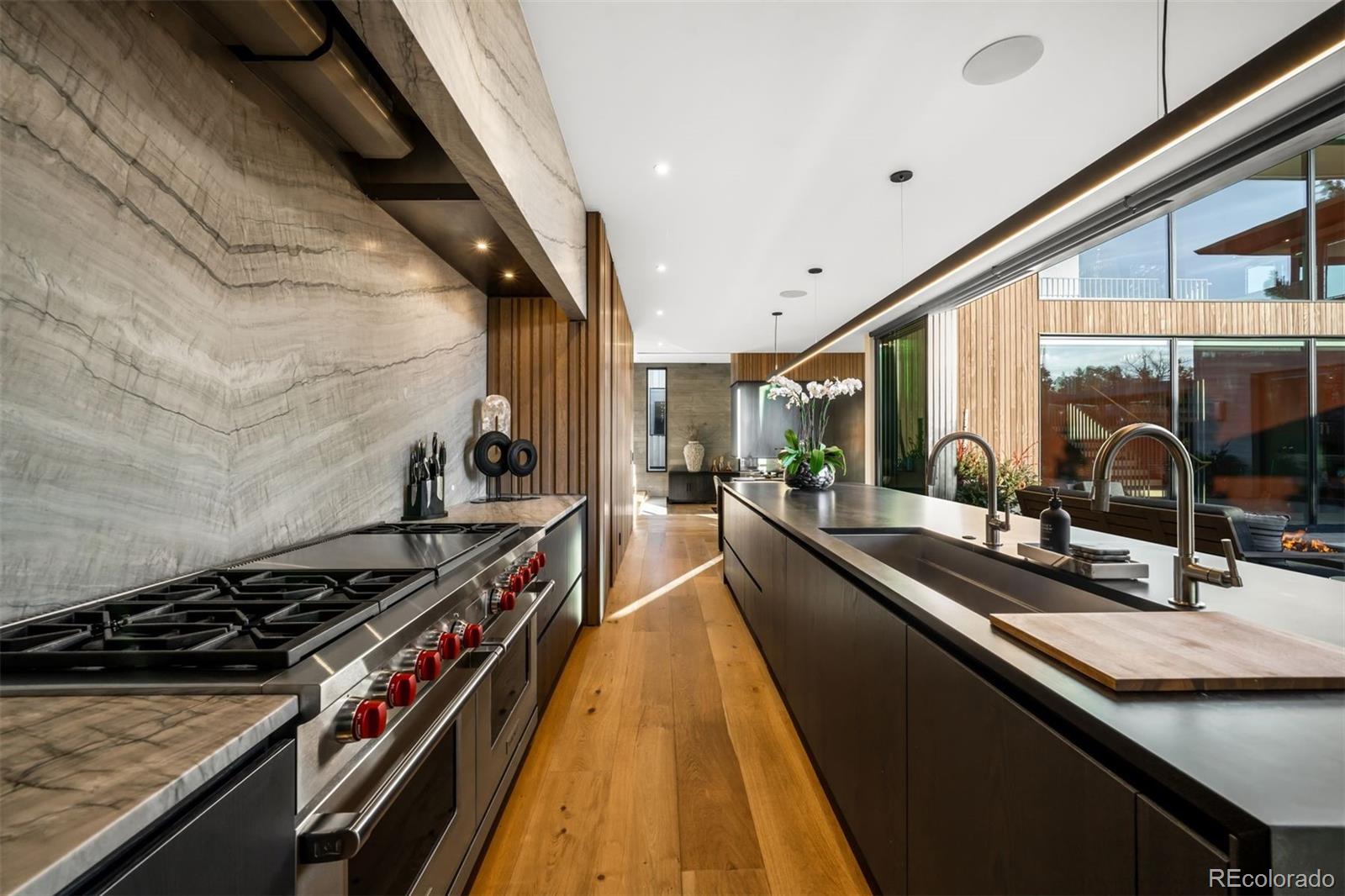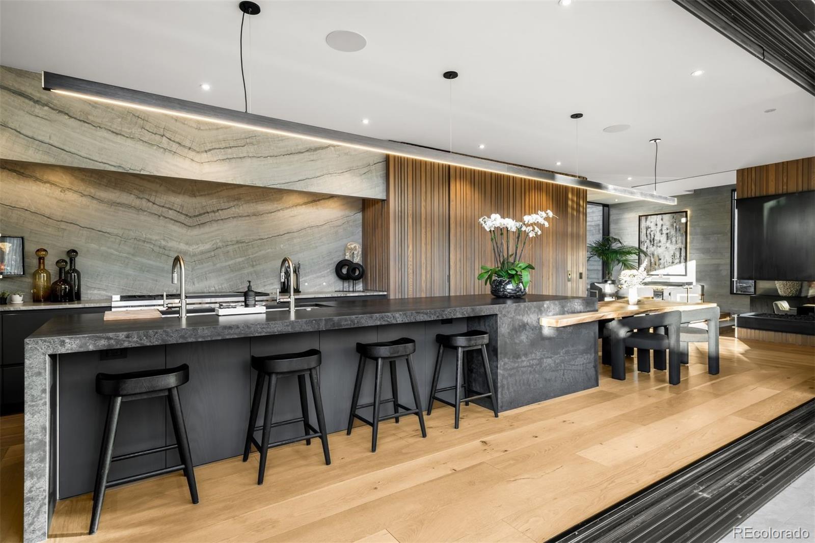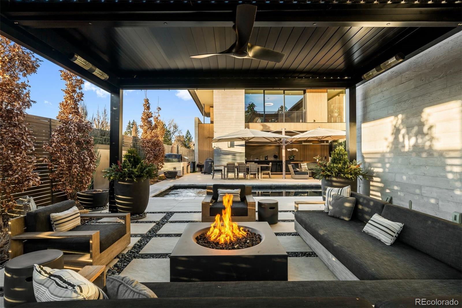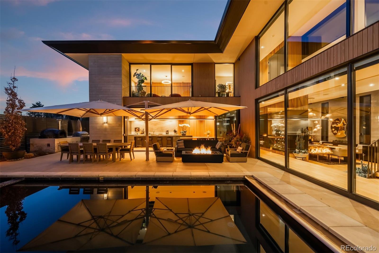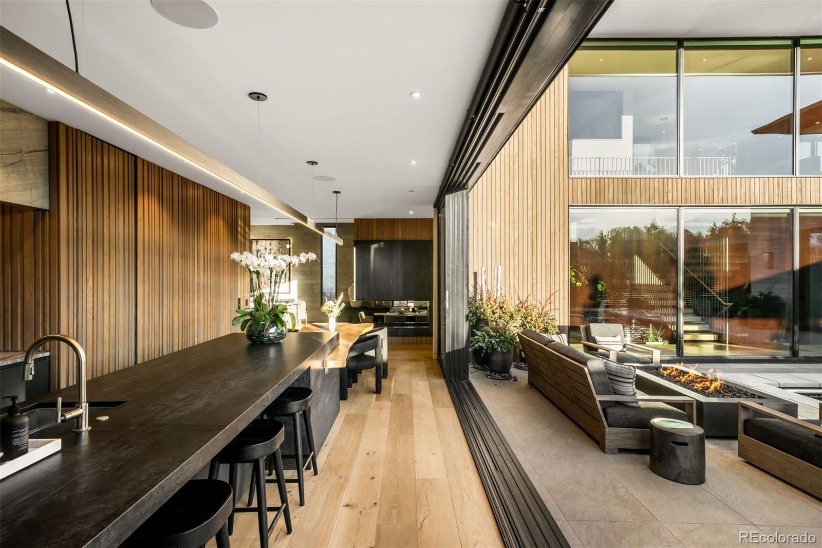 Behind the private gates of Cedar Estates, this striking, architecturally inspired residence is a thoughtful composition of steel, glass, and wood. Expansive sightlines unfold throughout, enhanced by generous ceiling heights and walls of glass that create an intimate and seamless connection between refined interiors and impeccably designed patios and courtyards. At the heart of the home, the main level centers around a chef-caliber kitchen featuring Wolf appliances, a Caesarstone waterfall island paired with a live-edge slab table, an oversized pantry, and an integrated wet bar and coffee nook. A full wall of sliding doors opens to a resort-style outdoor setting with a sleek pool and spa, outdoor kitchen, and multiple heated seating areas arranged around sculptural fire elements, allowing entertaining to flow effortlessly between indoor and outdoor spaces. Adjacent living and dining areas are anchored by a sculptural Bocci light installation, integrated wine storage, and a gas fireplace. The upper level serves as a private retreat, highlighted by a secluded primary suite with a spa-inspired bath featuring radiant heated floors, a steam shower, and a custom walk-in closet with laundry. Two additional spacious en suite bedrooms and a loft-style office complete the level. The fully finished lower level expands the home's livability with a media room, game room, wellness suite with gym and Finnleo infrared sauna, and two private guest suites. All levels are seamlessly connected by a private elevator. Outdoors, a pool and spa are complemented by covered patios, two fire pits, an outdoor kitchen, and serene landscaping, creating a true sanctuary just steps from the heart of Cherry Creek.
