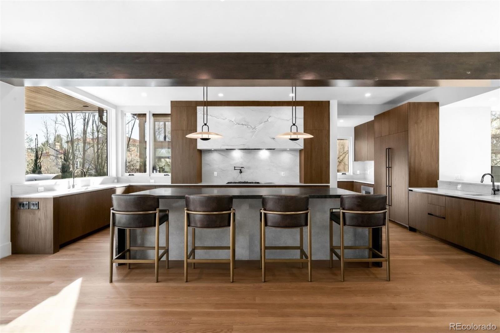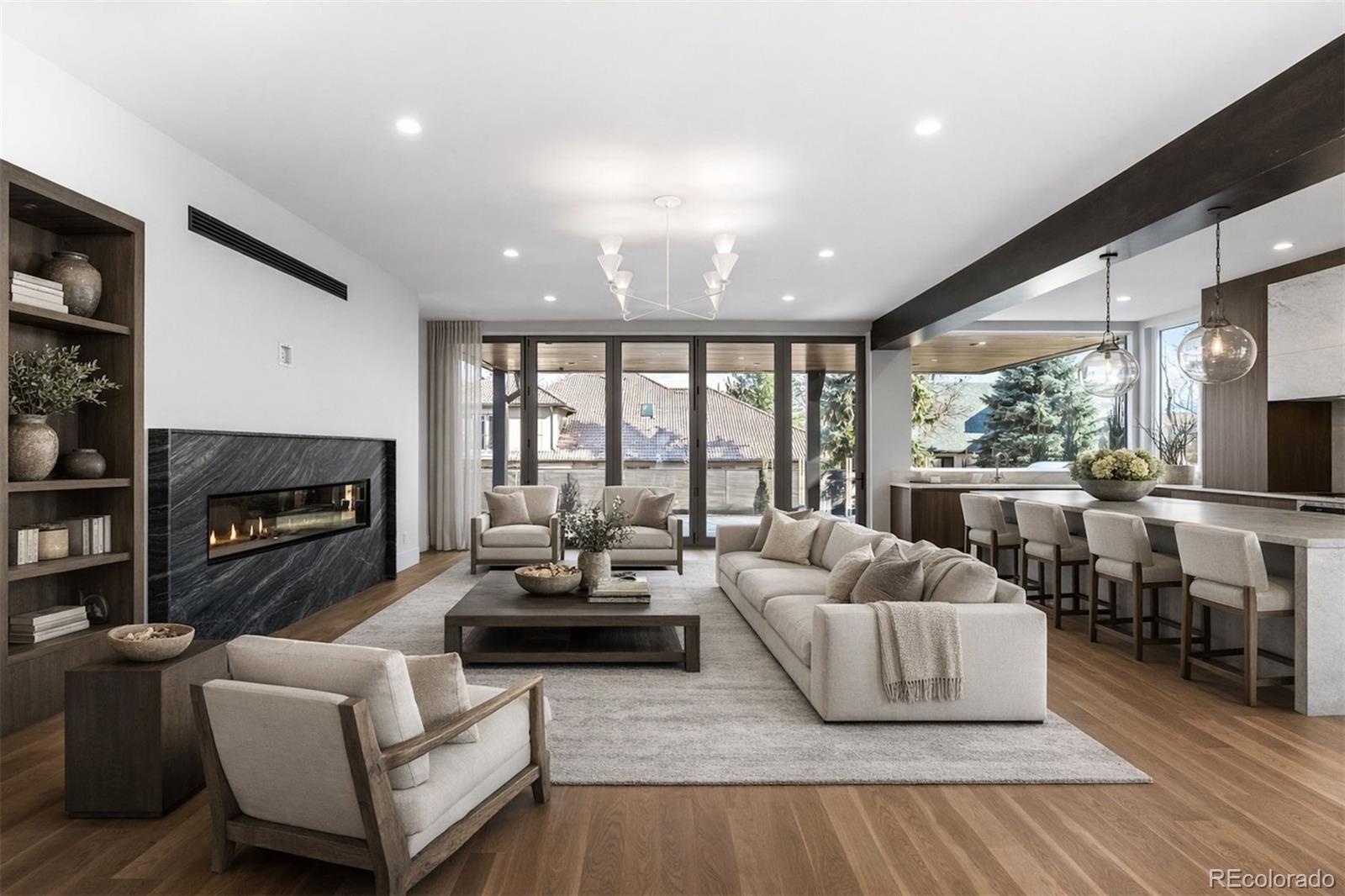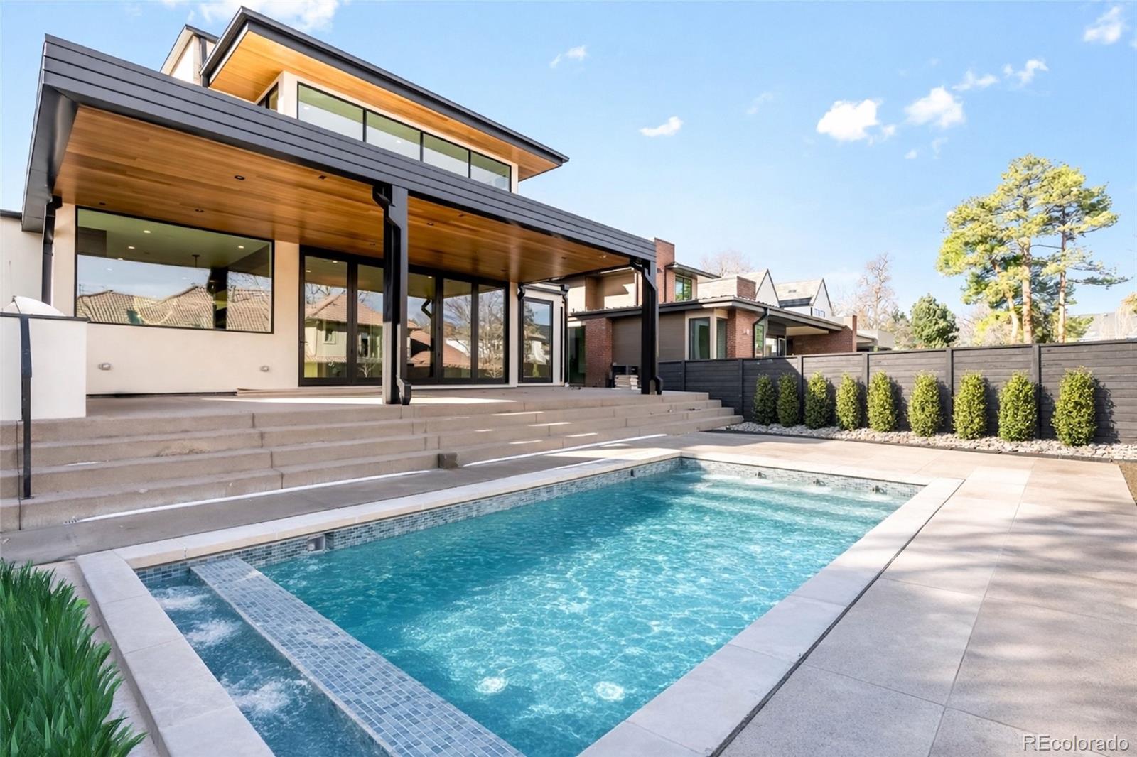Positioned on a rare quarter-acre site in the heart of Cherry Creek, this newly completed contemporary residence delivers 9,900 square feet of thoughtfully designed living space defined by architectural precision, exceptional materials, and seamless indoor-outdoor living. A dramatic entryway introduces expansive interiors filled with natural light, soaring ceilings, and wide-plank flooring. The main living space is anchored by a striking fireplace clad in leathered Silver Brown Waved marble and framed by folding Nano doors that open to the covered patio, outdoor kitchen, private pool, and landscaped grounds, creating an effortless connection between interior and exterior spaces. At the center of the home, the chef's kitchen blends performance and design with custom Italian cabinetry, Gaggenau appliances, a honed soapstone island, and a fully equipped back kitchen and walk-in pantry. Privately positioned in its own wing, the main level primary suite offers a tranquil retreat with a fireplace, spa-inspired bath with soaking tub and glass-enclosed shower, and a custom walk-in closet. A second main floor primary suite located on the south side of the home offers additional flexibility for guests or multigenerational living. Upstairs, three spacious bedrooms each feature en-suite baths, while a recreation lounge with a wet bar opens to a private terrace designed for elevated entertaining. The lower level is dedicated to leisure and wellness with a large gathering space, wet bar finished in Matarazzo Dolomite, fitness studio, game room ideal for a golf simulator or theater, and a secluded guest suite. Additional highlights include a glass-enclosed wine display, elevator, and a finished four-car tandem garage. Located moments from Cherry Creek North's premier dining and boutiques, and within the Cory Merrill school district, this residence represents a rare opportunity to own a newly built architectural home in one of Denver's most sought-after neighborhoods.