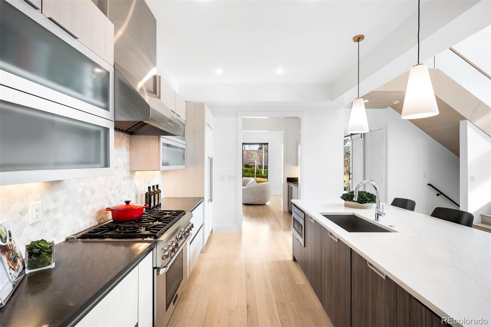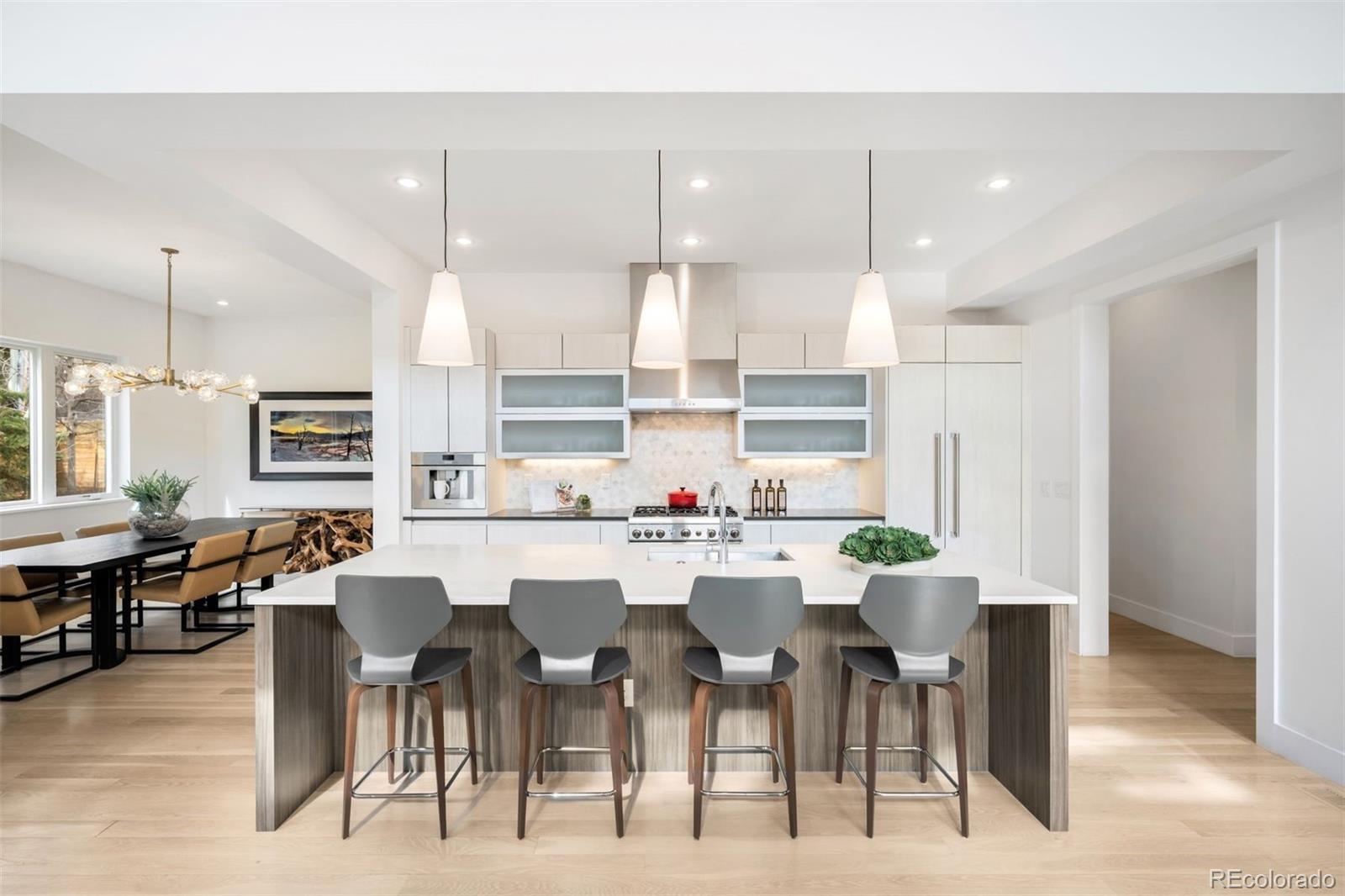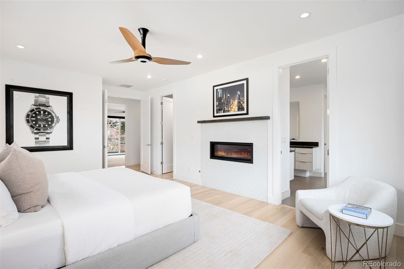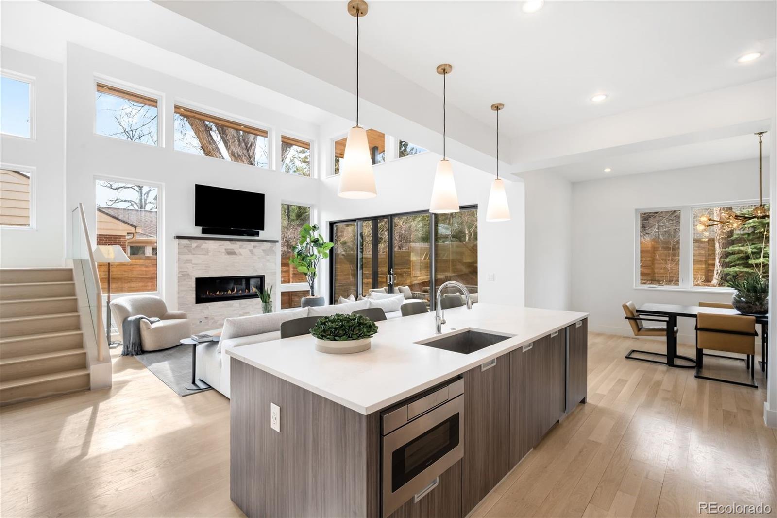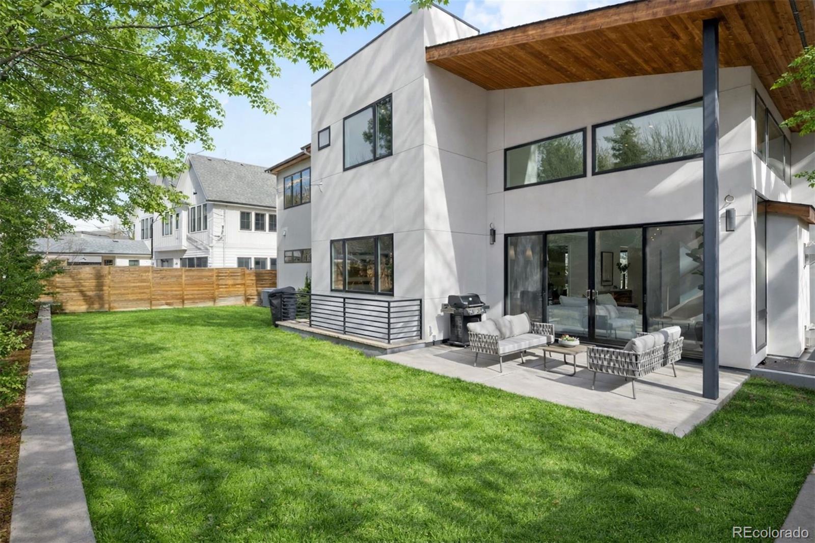 Set on one of the most coveted blocks in Stokes Belcaro, this California Contemporary residence pairs striking architecture with warm, light-filled interiors on a beautifully landscaped 10,200-square-foot lot, just moments from Cherry Creek. Step inside to a dramatic great room with soaring ceilings and expansive windows and sliding doors that flood the home with natural light and seamlessly connect indoor and outdoor living. The open layout flows effortlessly from the living area to the backyard, creating an ideal setting for both everyday living and entertaining. At the heart of the home, the chef's kitchen features sleek European Kabi cabinetry, quartz countertops, and high-end appliances, including a built-in Miele coffee machine, six-burner gas range, and dual dishwashers. A walk-in pantry and butler's pantry streamline the kitchen's form and function. Upstairs, the primary suite offers a private retreat with a fireplace, custom walk-in closet, and spa-like five-piece bath with a soaking tub and dual-head shower. Three additional en-suite bedrooms and a spacious laundry room complete the upper level. The finished lower level is designed for entertaining and relaxation, featuring 10-foot ceilings, a large recreation space, a fitness studio, a wet bar, and a private guest suite. Additional highlights include smart HVAC, custom closet systems, and a rare oversized four-car attached garage. Ideally located near the Cherry Creek Bike Trail, nearby parks, Cherry Creek North, shopping, dining, and the farmers market, this home offers an exceptional lifestyle in a premier location.