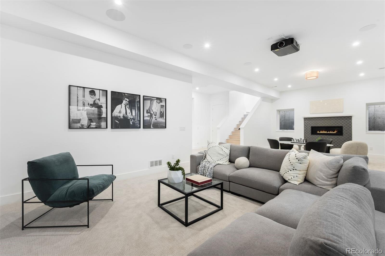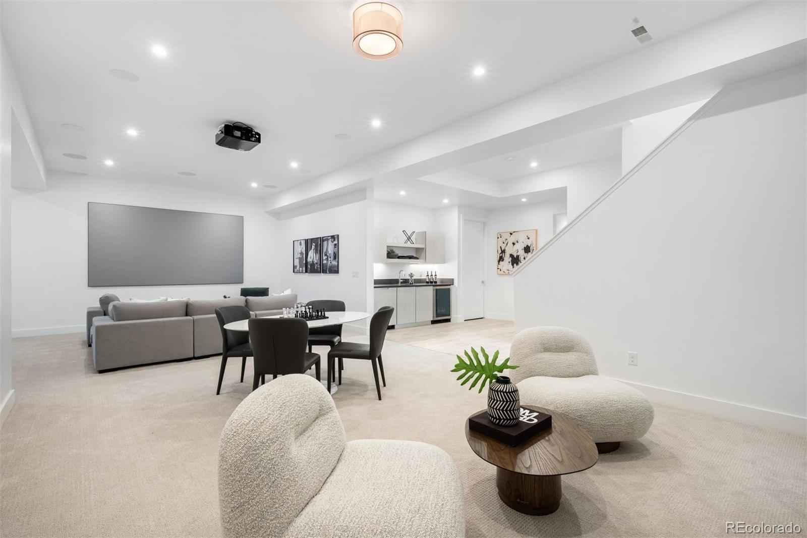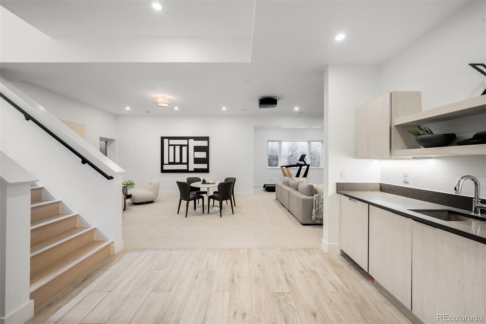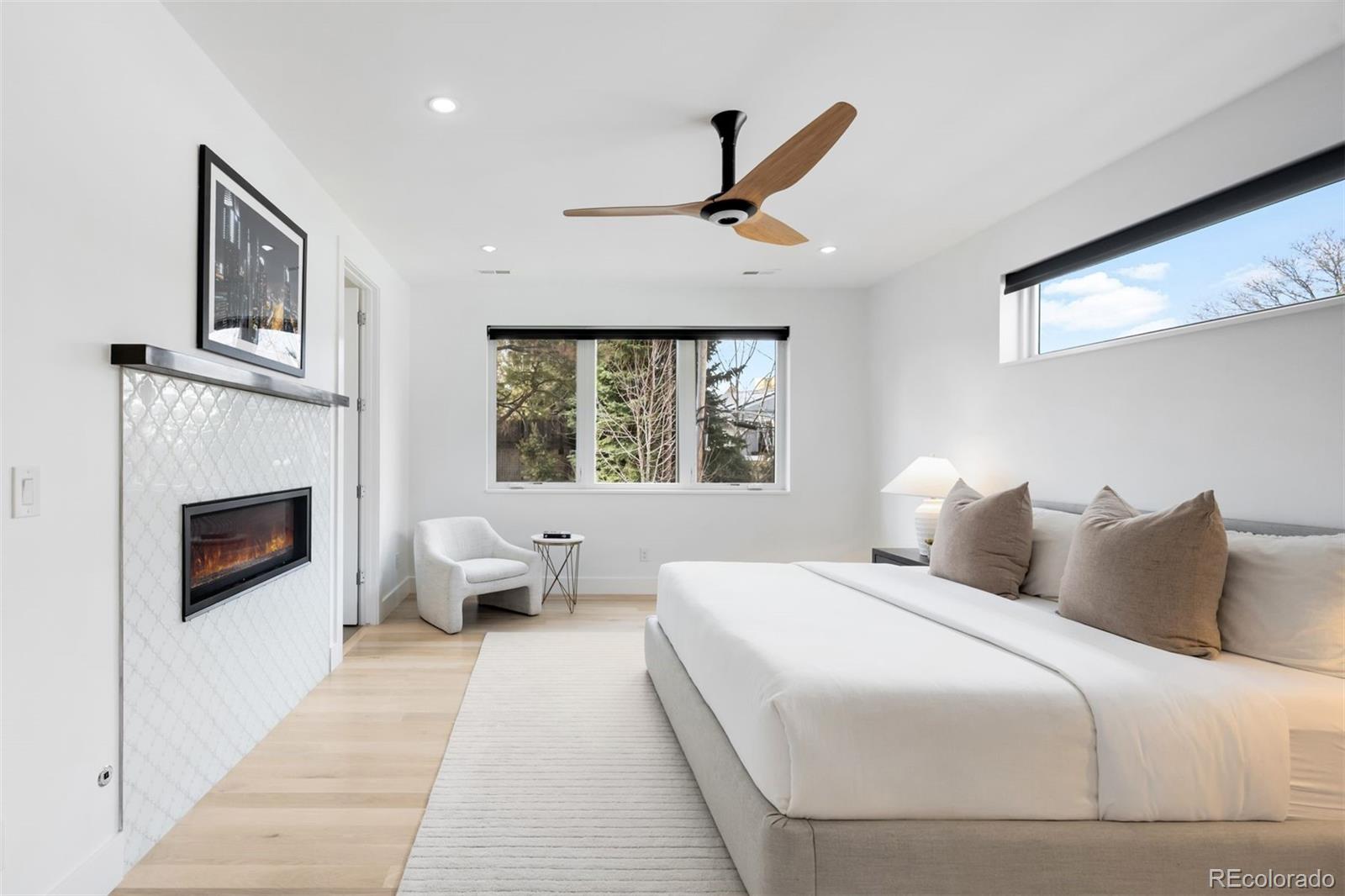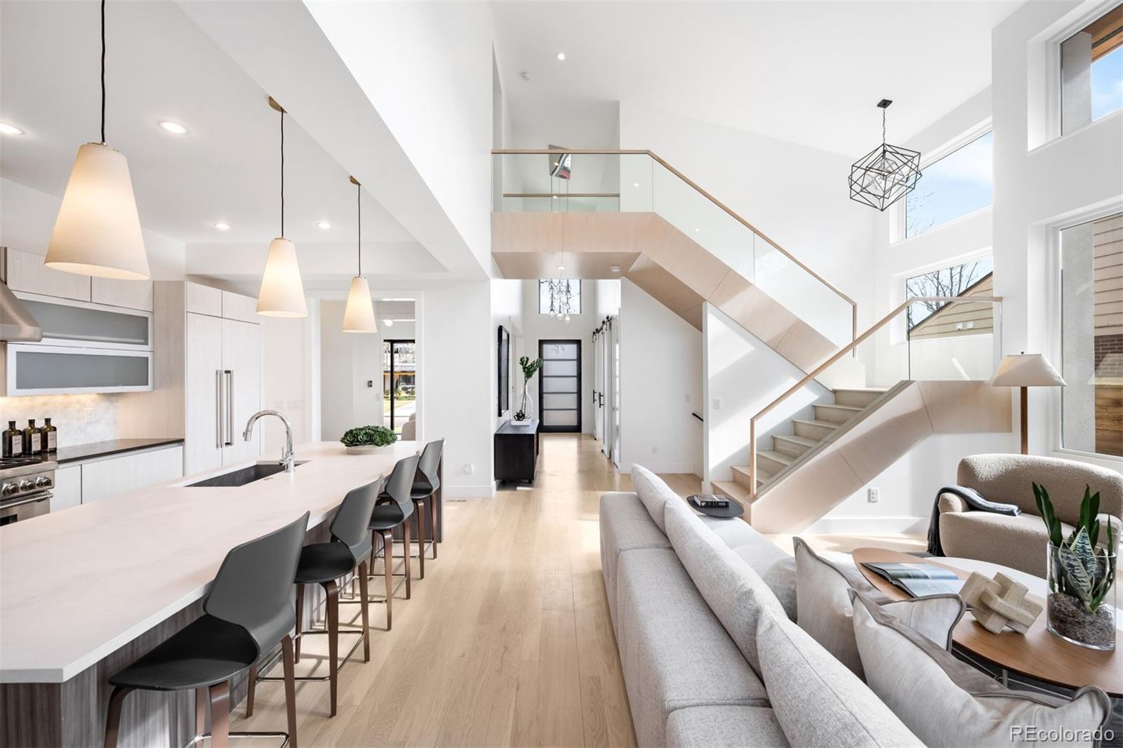 Set on one of the most coveted blocks in Stokes Belcaro, this California Contemporary residence pairs striking architecture with warm, light-filled interiors on a beautifully landscaped 10,200-square-foot lot, just moments from Cherry Creek. Step inside to a dramatic great room with soaring ceilings and expansive windows and sliding doors that flood the home with natural light and seamlessly connect indoor and outdoor living. The open layout flows effortlessly from the living area to the backyard, creating an ideal setting for both everyday living and entertaining. At the heart of the home, the chef's kitchen features sleek European Kabi cabinetry, quartz countertops, and high-end appliances, including a built-in Miele coffee machine, six-burner gas range, and dual dishwashers. A walk-in pantry and butler's pantry streamline the kitchen's form and function. Upstairs, the primary suite offers a private retreat with a fireplace, custom walk-in closet, and spa-like five-piece bath with a soaking tub and dual-head shower. Three additional en-suite bedrooms and a spacious laundry room complete the upper level. The finished lower level is designed for entertaining and relaxation, featuring 10-foot ceilings, a large recreation space, a fitness studio, a wet bar, and a private guest suite. Additional highlights include smart HVAC, custom closet systems, and a rare oversized four-car attached garage. Ideally located near the Cherry Creek Bike Trail, nearby parks, Cherry Creek North, shopping, dining, and the farmers market, this home offers an exceptional lifestyle in a premier location.