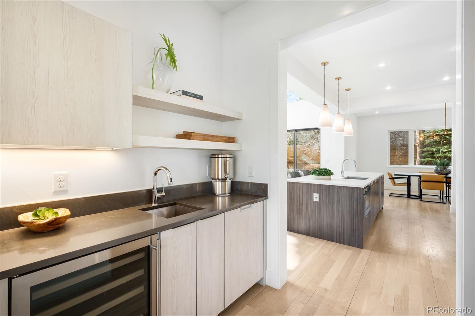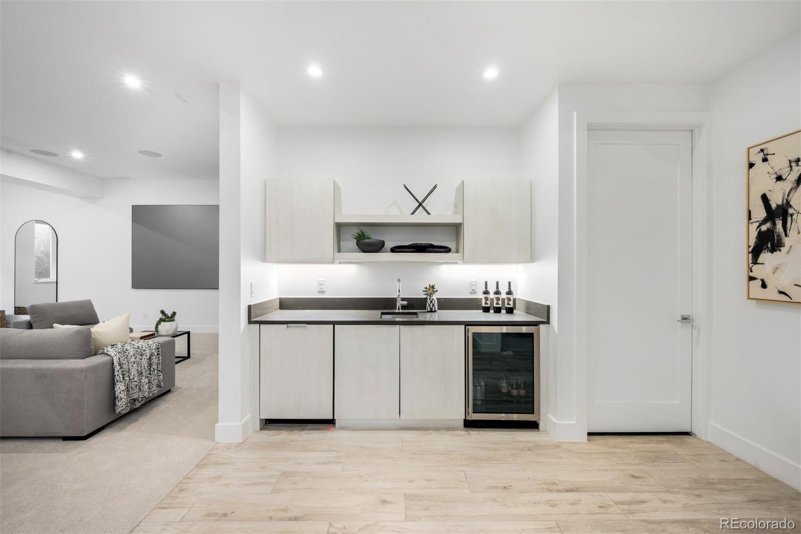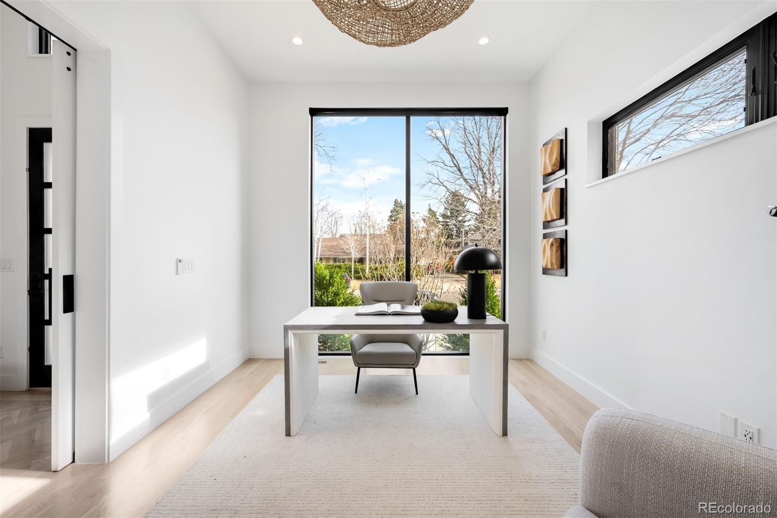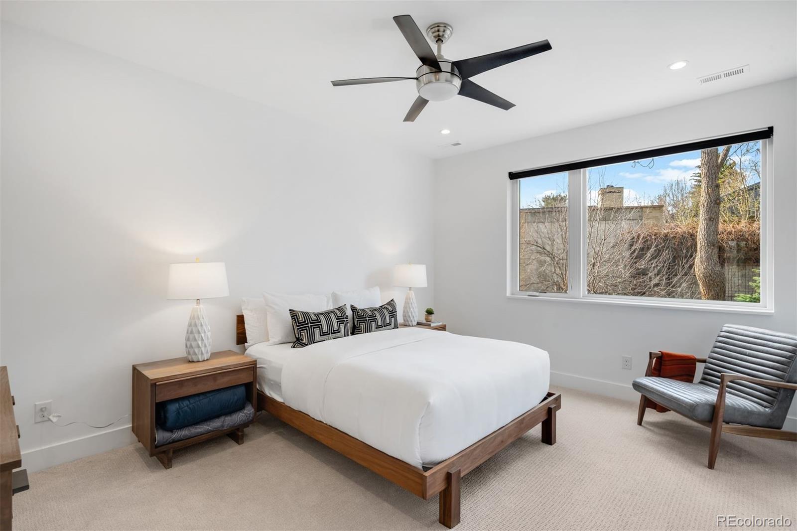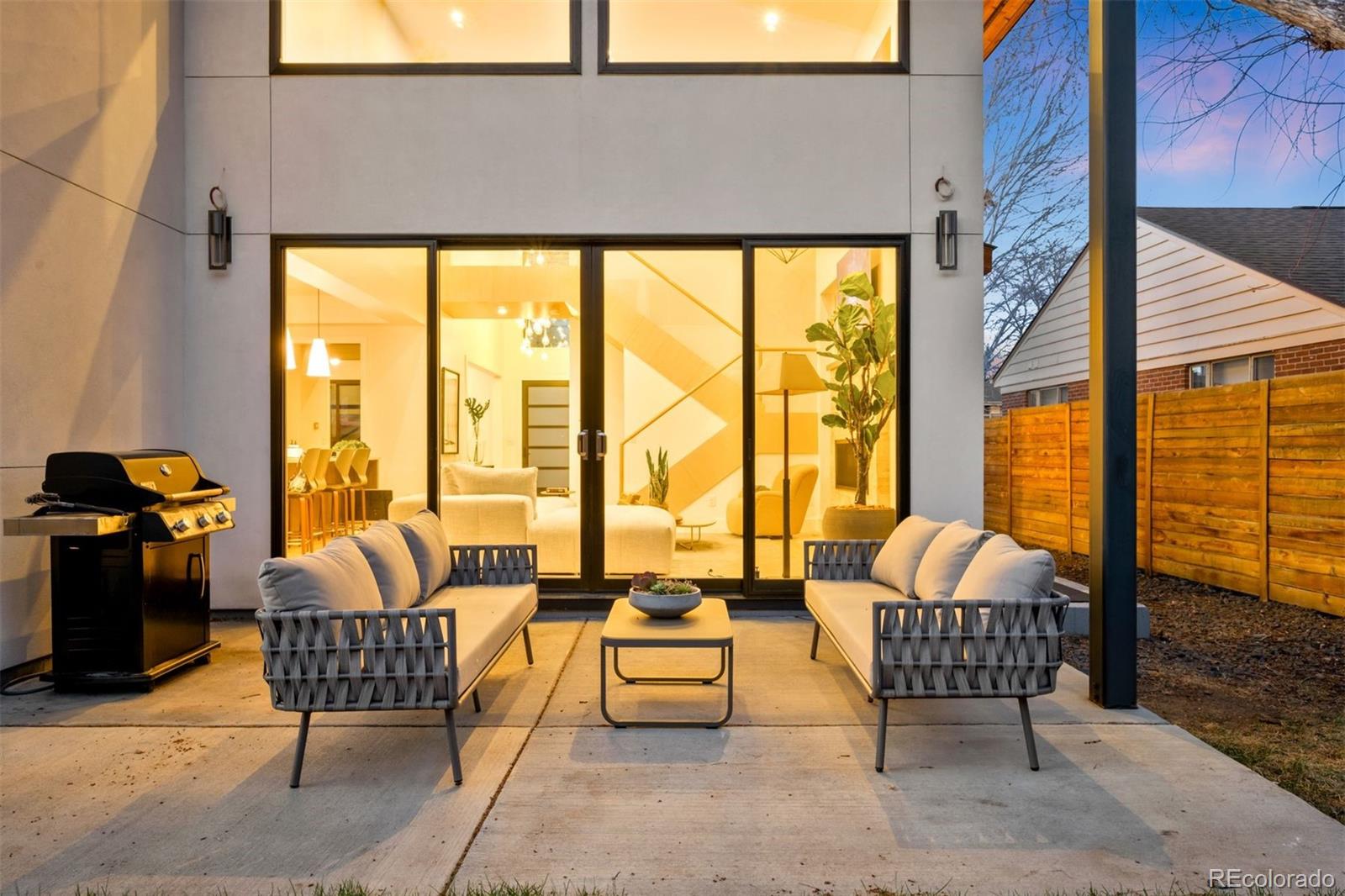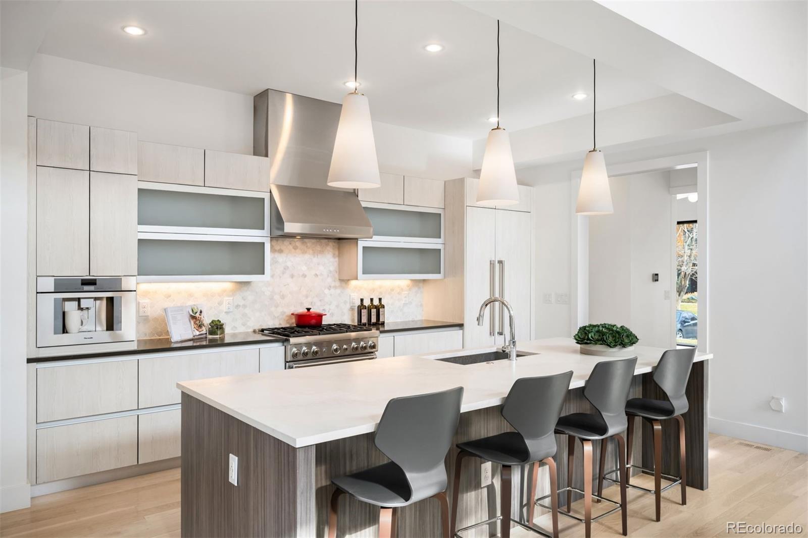 Set on one of the most coveted blocks in Stokes Belcaro, this California Contemporary residence pairs striking architecture with warm, light-filled interiors on a beautifully landscaped 10,200-square-foot lot, just moments from Cherry Creek. Step inside to a dramatic great room with soaring ceilings and expansive windows and sliding doors that flood the home with natural light and seamlessly connect indoor and outdoor living. The open layout flows effortlessly from the living area to the backyard, creating an ideal setting for both everyday living and entertaining. At the heart of the home, the chef's kitchen features sleek European Kabi cabinetry, quartz countertops, and high-end appliances, including a built-in Miele coffee machine, six-burner gas range, and dual dishwashers. A walk-in pantry and butler's pantry streamline the kitchen's form and function. Upstairs, the primary suite offers a private retreat with a fireplace, custom walk-in closet, and spa-like five-piece bath with a soaking tub and dual-head shower. Three additional en-suite bedrooms and a spacious laundry room complete the upper level. The finished lower level is designed for entertaining and relaxation, featuring 10-foot ceilings, a large recreation space, a fitness studio, a wet bar, and a private guest suite. Additional highlights include smart HVAC, custom closet systems, and a rare oversized four-car attached garage. Ideally located near the Cherry Creek Bike Trail, nearby parks, Cherry Creek North, shopping, dining, and the farmers market, this home offers an exceptional lifestyle in a premier location.