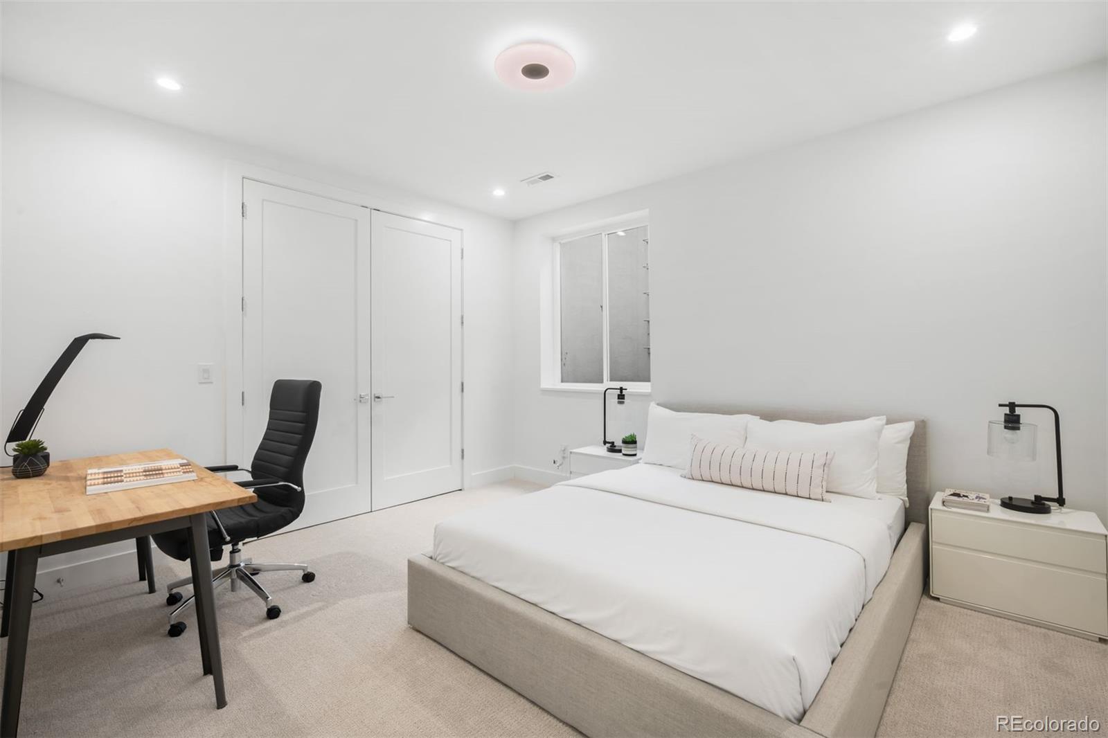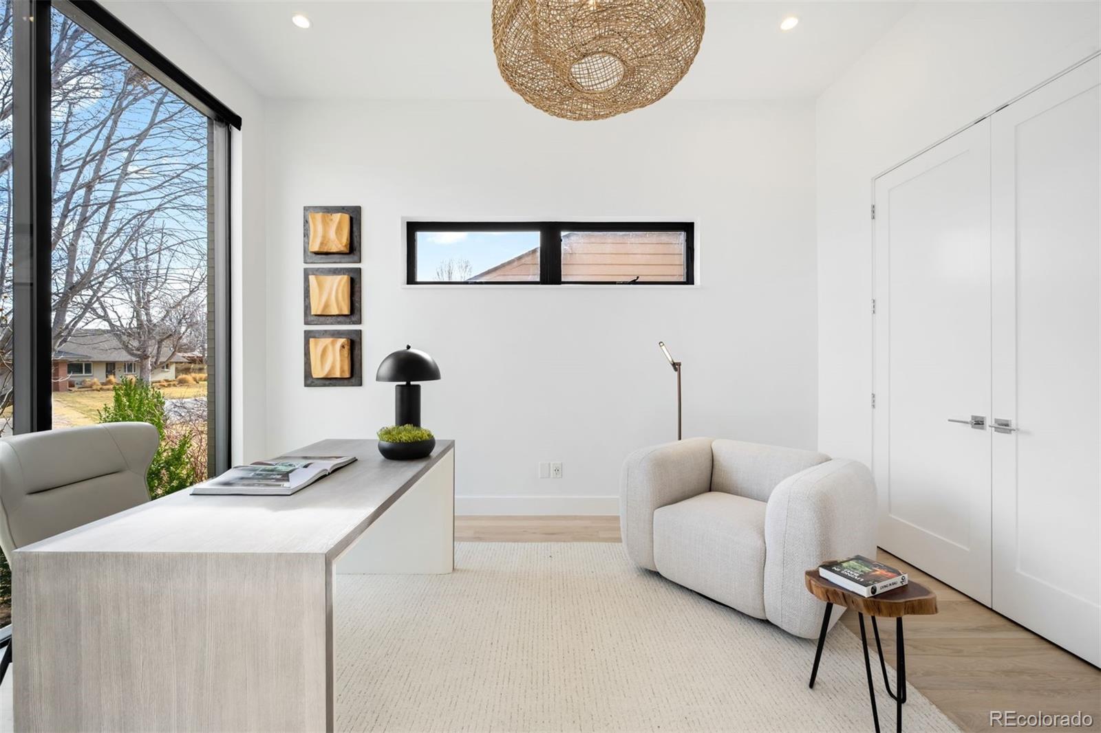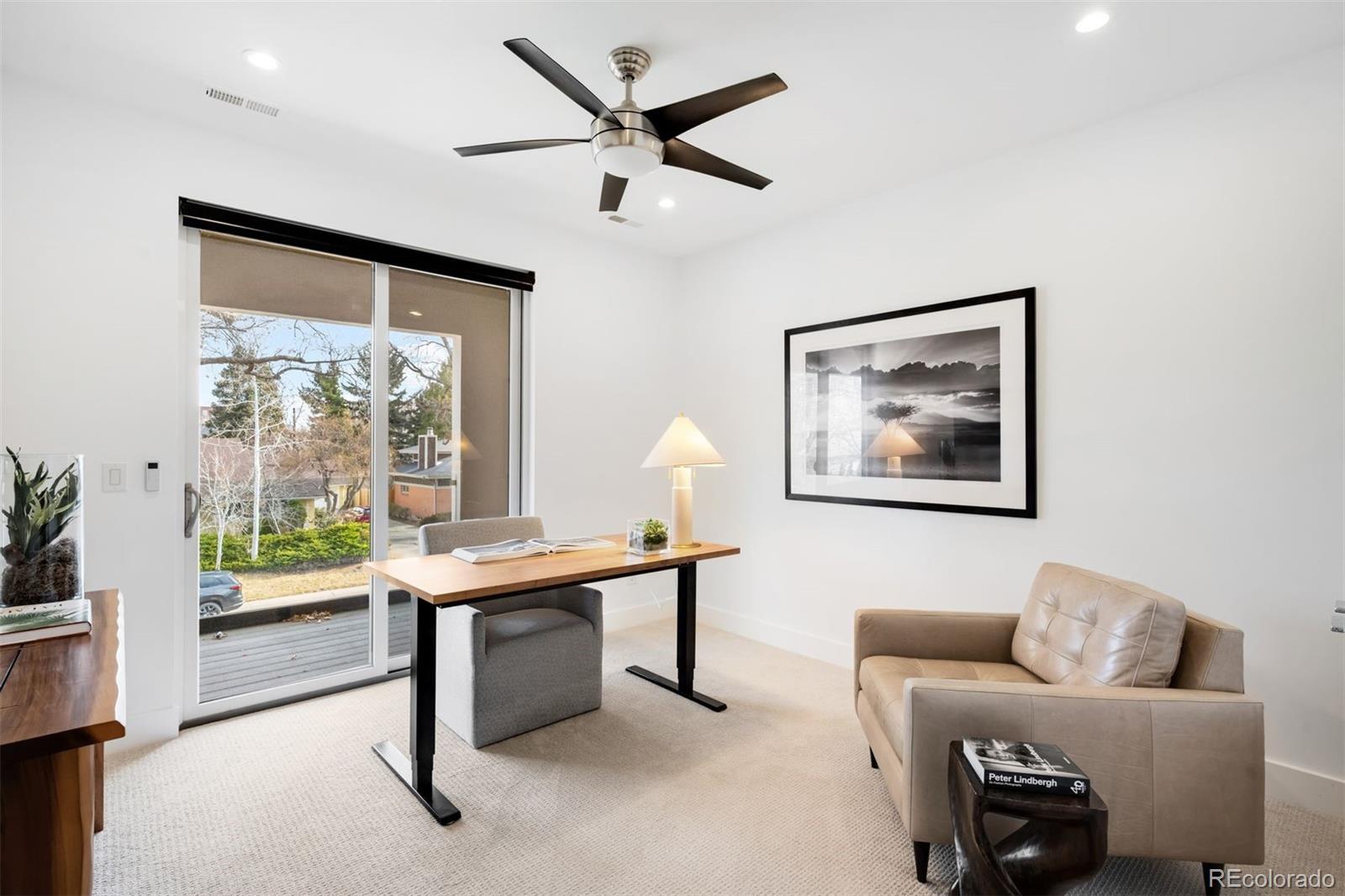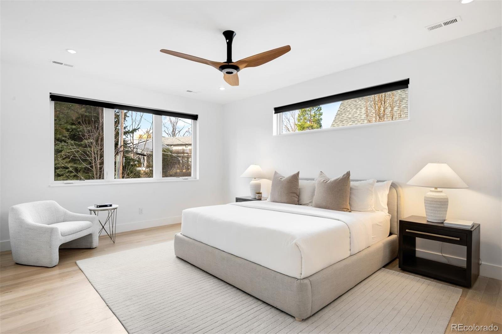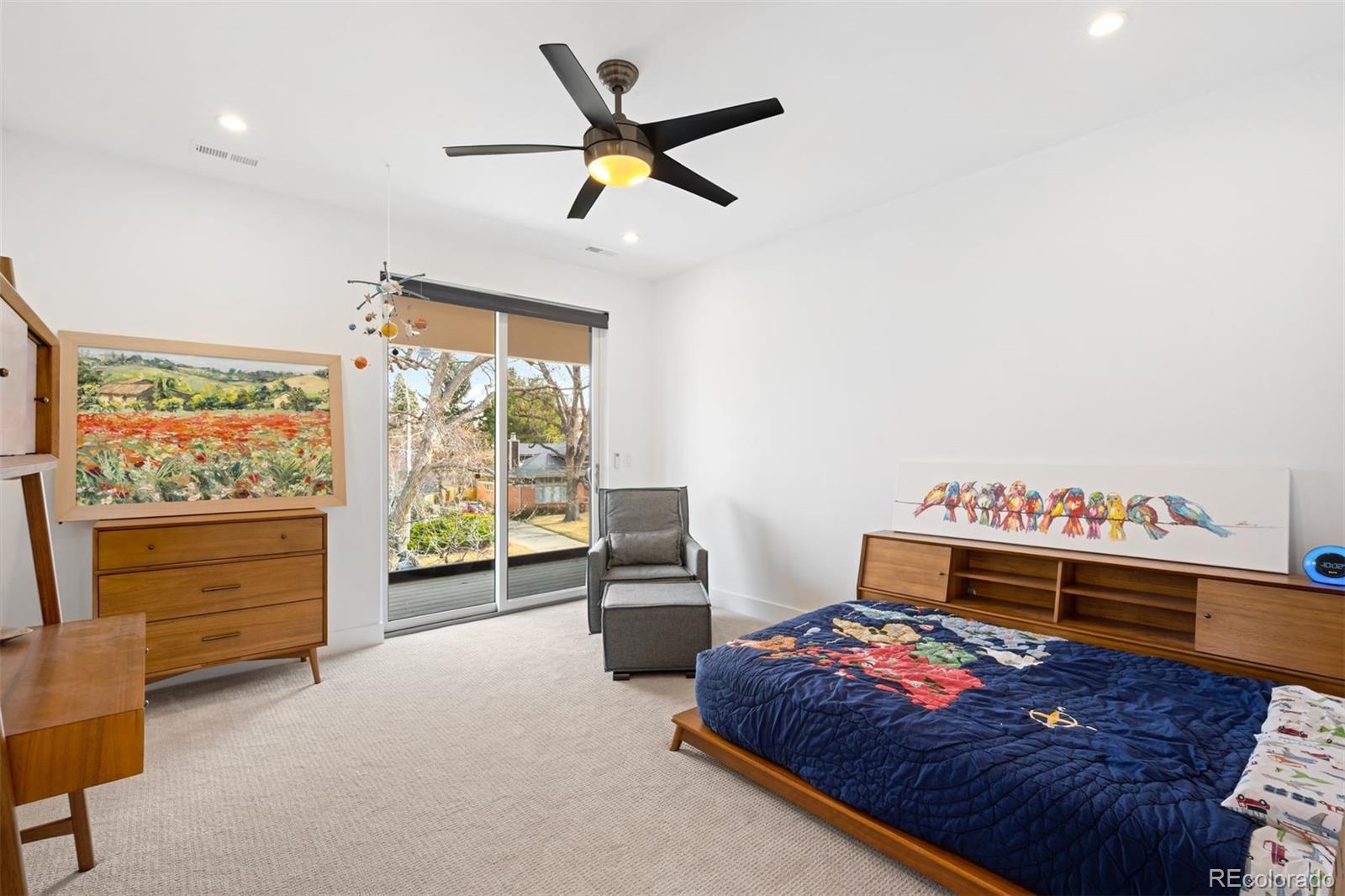 Set on one of the most coveted blocks in Stokes Belcaro, this California Contemporary residence pairs striking architecture with warm, light-filled interiors on a beautifully landscaped 10,200-square-foot lot, just moments from Cherry Creek. Step inside to a dramatic great room with soaring ceilings and expansive windows and sliding doors that flood the home with natural light and seamlessly connect indoor and outdoor living. The open layout flows effortlessly from the living area to the backyard, creating an ideal setting for both everyday living and entertaining. At the heart of the home, the chef's kitchen features sleek European Kabi cabinetry, quartz countertops, and high-end appliances, including a built-in Miele coffee machine, six-burner gas range, and dual dishwashers. A walk-in pantry and butler's pantry streamline the kitchen's form and function. Upstairs, the primary suite offers a private retreat with a fireplace, custom walk-in closet, and spa-like five-piece bath with a soaking tub and dual-head shower. Three additional en-suite bedrooms and a spacious laundry room complete the upper level. The finished lower level is designed for entertaining and relaxation, featuring 10-foot ceilings, a large recreation space, a fitness studio, a wet bar, and a private guest suite. Additional highlights include smart HVAC, custom closet systems, and a rare oversized four-car attached garage. Ideally located near the Cherry Creek Bike Trail, nearby parks, Cherry Creek North, shopping, dining, and the farmers market, this home offers an exceptional lifestyle in a premier location.
