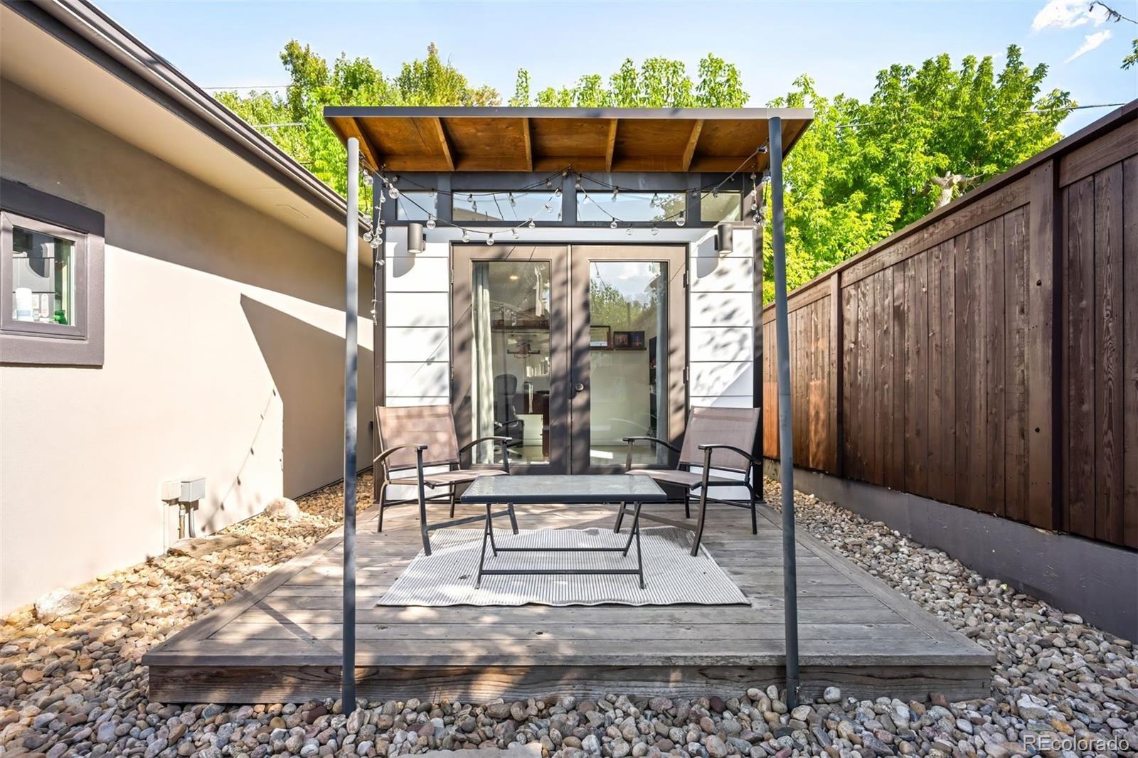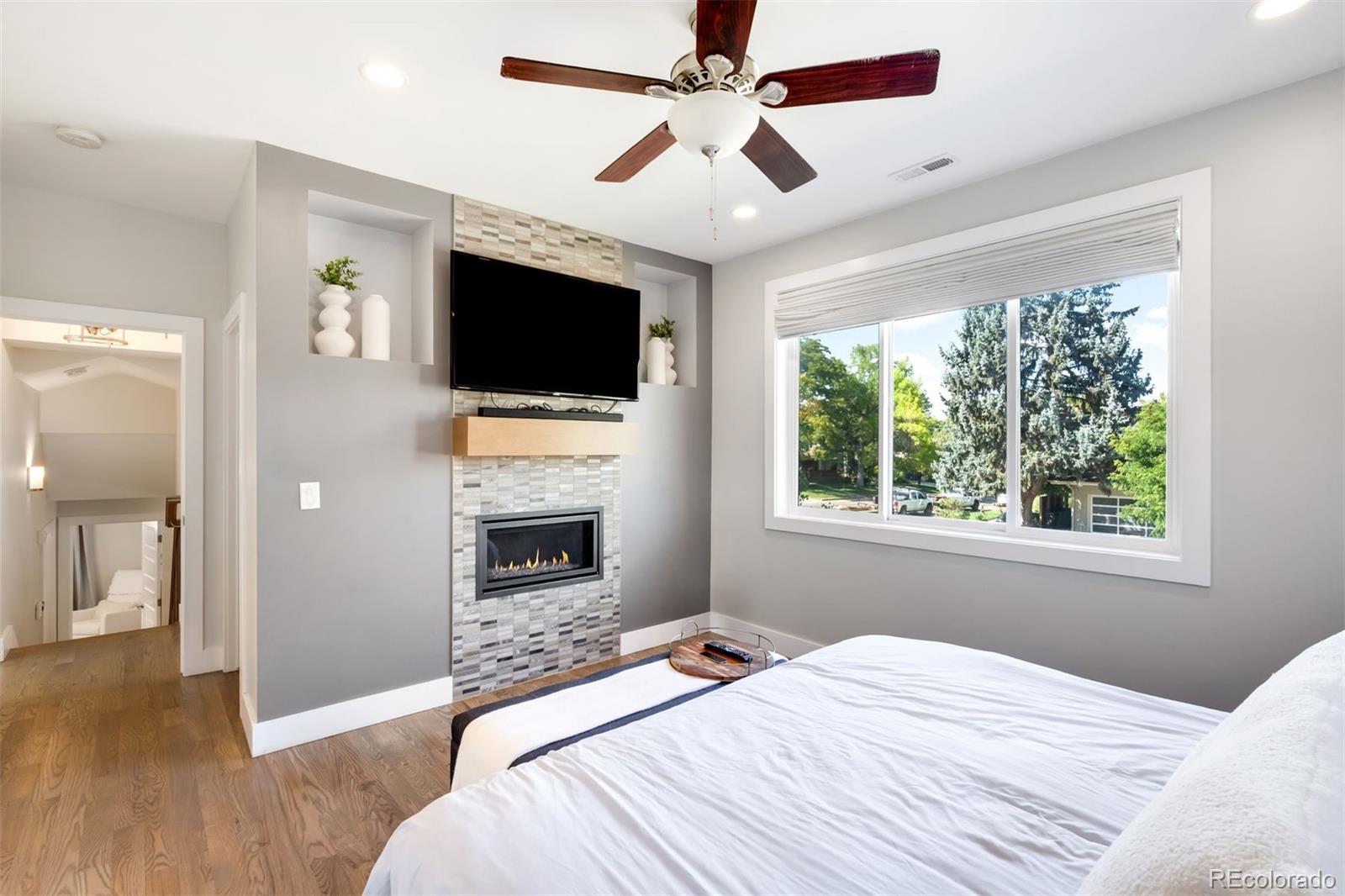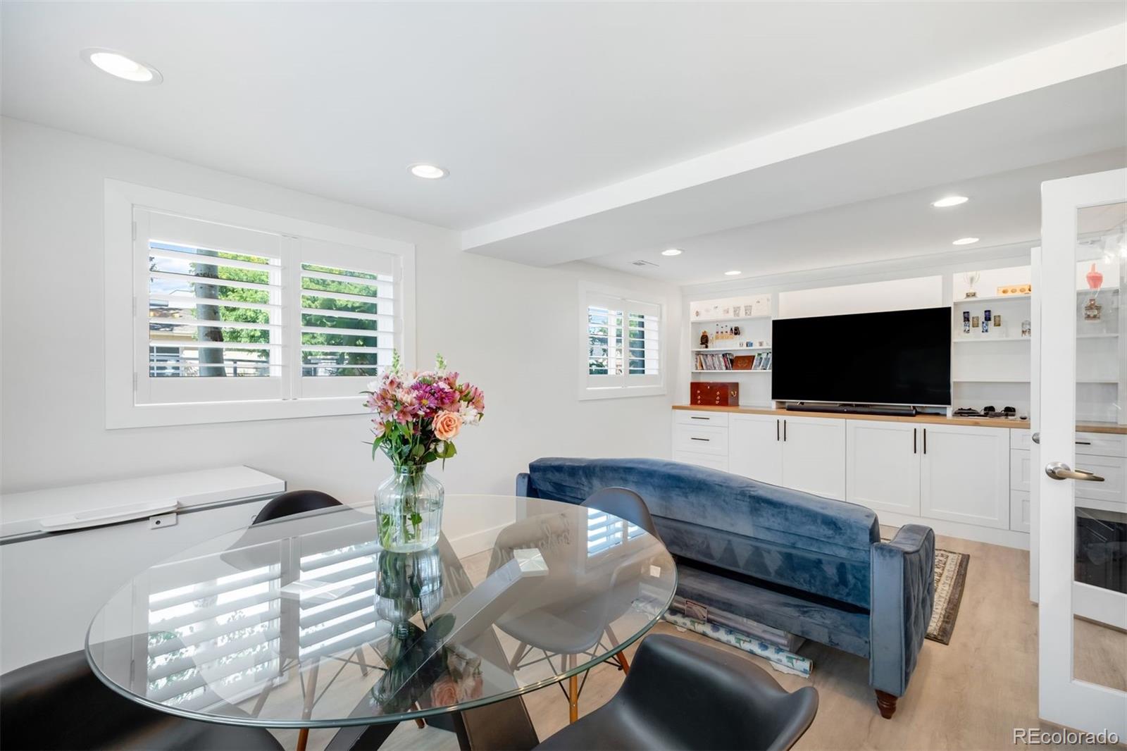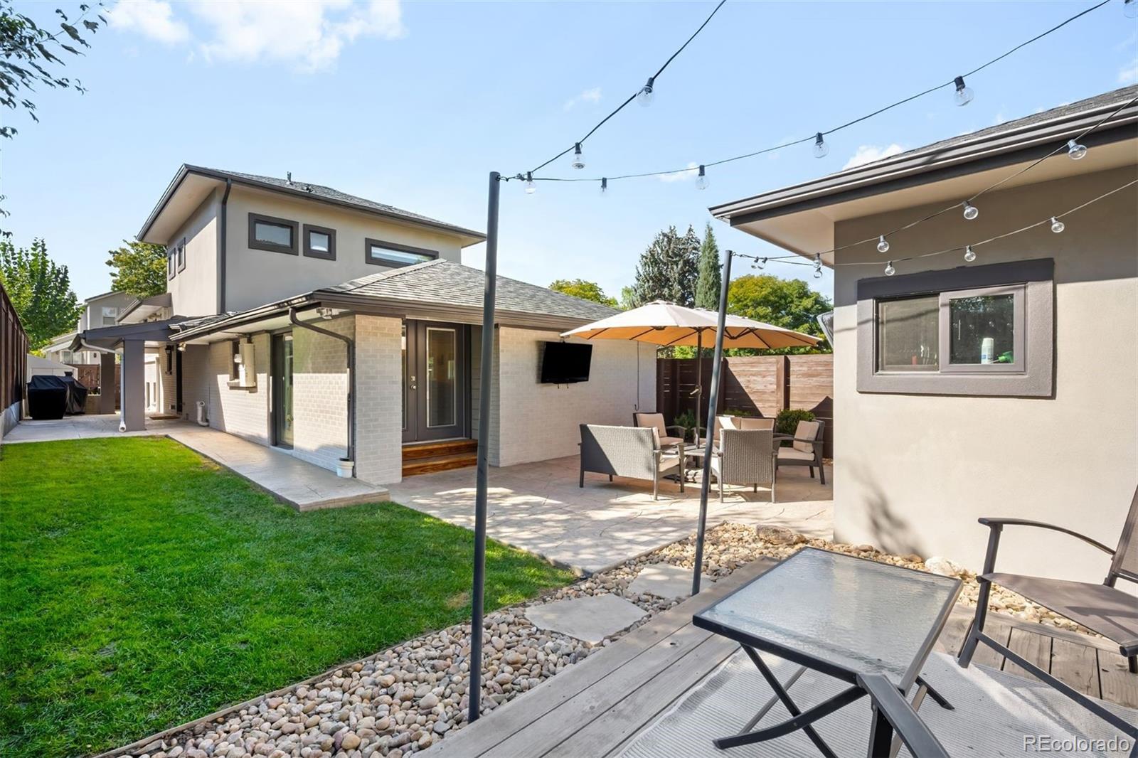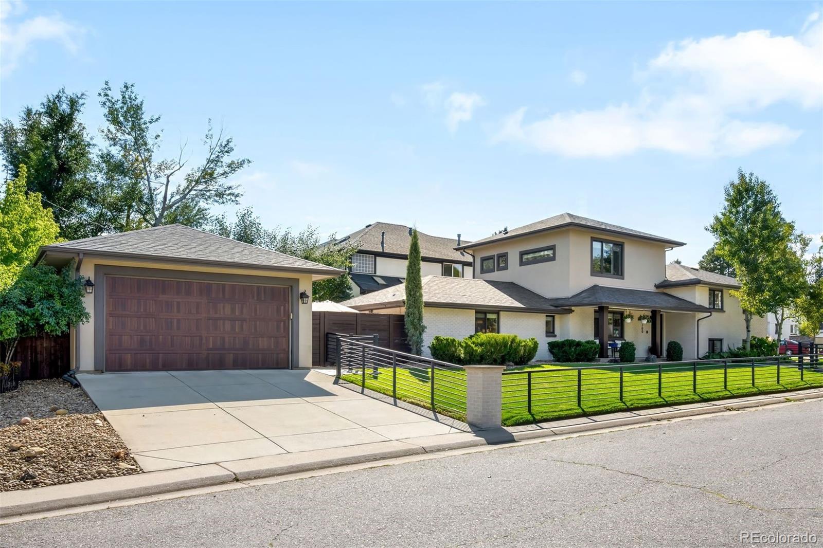In the heart of Crestmoor Park, this beautifully updated 5-bedroom, 4-bath home blends thoughtful design, modern amenities, and a prime location just steps from one of Denver's most cherished parks. The chef's kitchen is designed for everyday ease and entertaining, featuring granite countertops, a large island, open shelving, a coffee bar, and the rare combination of dual Bosch ovens, dual dishwashers, and dual sinks. Natural light pours in from oversized windows, with direct access to the side patio extending the space outdoors. The dining area is bright and welcoming, while the living room showcases soaring ceilings, a sleek stone-surround fireplace, and doors that open to the private backyard. The lower level is an entertainer's dream with a custom wet bar, built-ins, and space for a media lounge or game table. A secluded guest suite with an adjacent full bath completes this level. Upstairs, three secondary bedrooms share full baths and provide flexible options for playrooms, home offices, or guest quarters. The third floor is reserved for the primary suite, a retreat with its own fireplace, a walk-in closet, and a spa-like 5-piece bath with dual vanities, soaking tub, and walk-in shower. A conveniently placed laundry room adds practicality. Outdoors, the backyard is landscaped for gatherings with a stamped concrete patio, dining space, and mature greenery. The detached two-car garage includes a mini-split system for year-round comfort, and the detached Studio Shed, also with a mini-split, is ideal as a home office, gym, or creative studio. Just steps from Crestmoor Park and within walking distance of Pete's Market, Park Burger, and Boulevard One at Lowry, this home is also minutes from Cherry Creek. Top-rated schools, neighborhood favorites like High Point Creamery and Call Your Mother Deli, and community amenities including the Crestmoor Community Center are all nearby. This home is the complete package: spacious, stylish, and perfectly located.