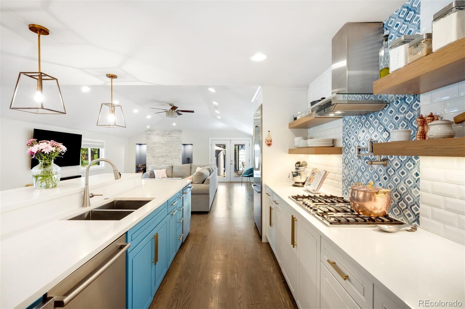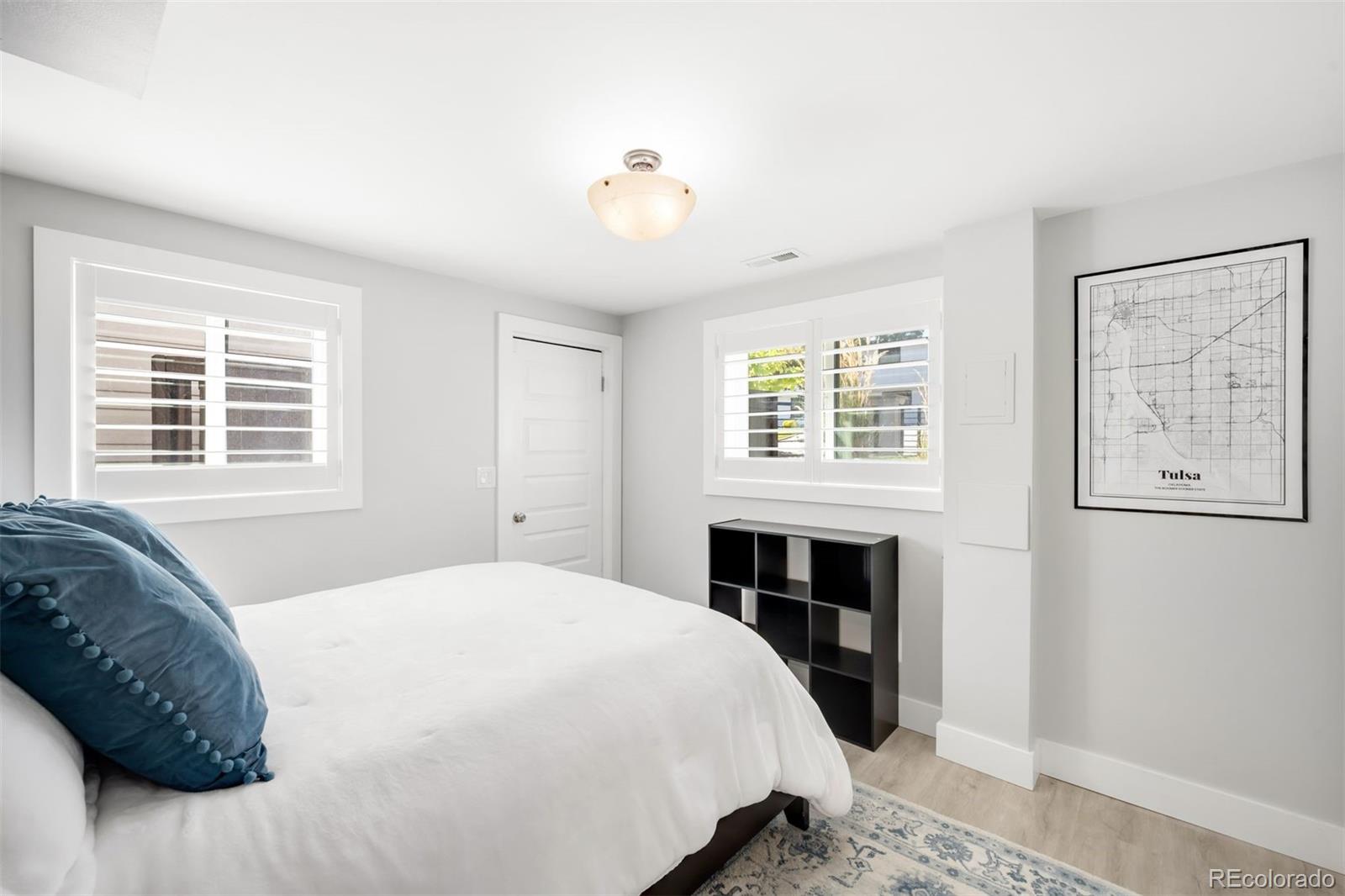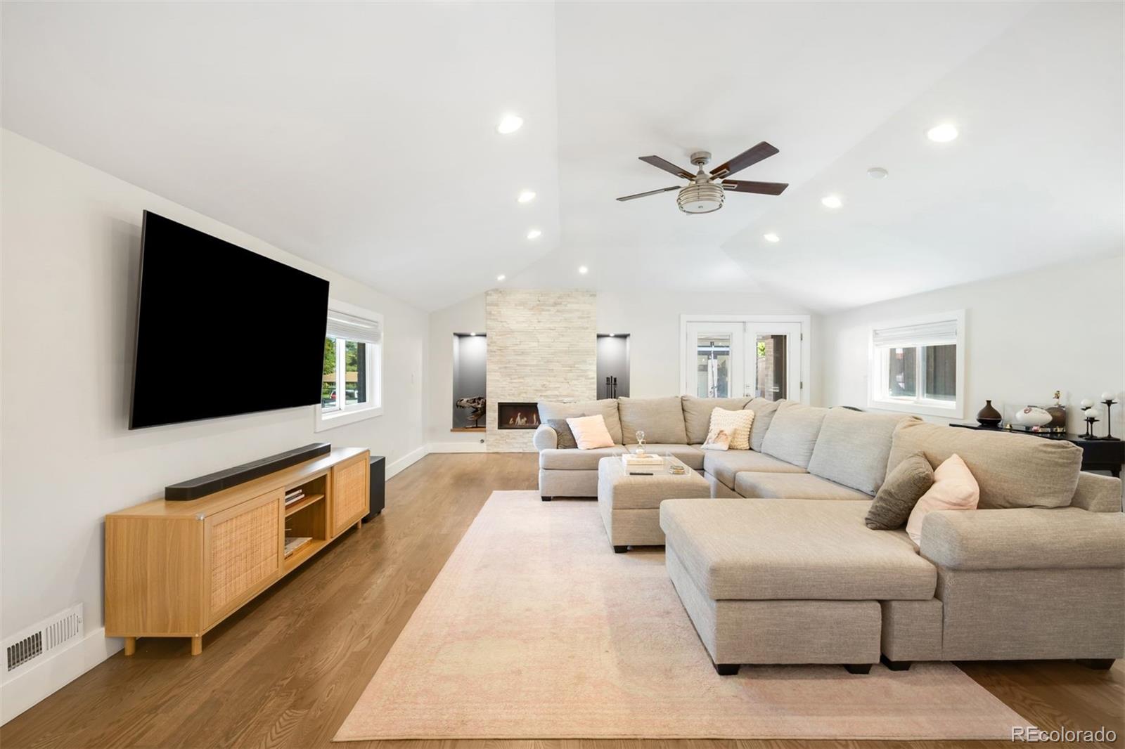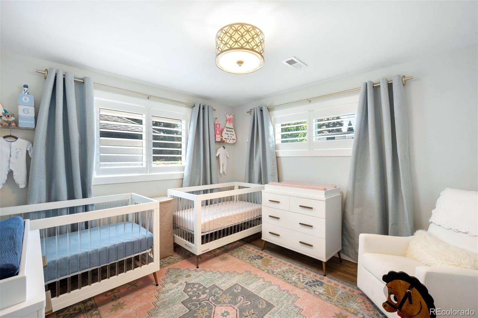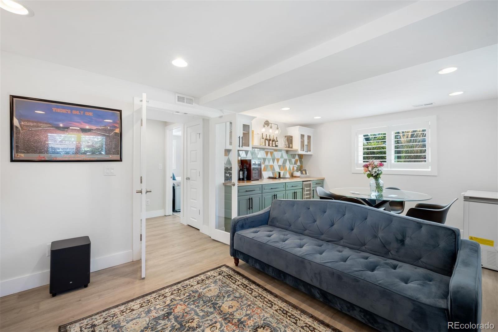 In the heart of Crestmoor Park, this beautifully updated 5-bedroom, 4-bath home blends thoughtful design, modern amenities, and a prime location just steps from one of Denver's most cherished parks. The chef's kitchen is designed for everyday ease and entertaining, featuring granite countertops, a large island, open shelving, a coffee bar, and the rare combination of dual Bosch ovens, dual dishwashers, and dual sinks. Natural light pours in from oversized windows, with direct access to the side patio extending the space outdoors. The dining area is bright and welcoming, while the living room showcases soaring ceilings, a sleek stone-surround fireplace, and doors that open to the private backyard. The lower level is an entertainer's dream with a custom wet bar, built-ins, and space for a media lounge or game table. A secluded guest suite with an adjacent full bath completes this level. Upstairs, three secondary bedrooms share full baths and provide flexible options for playrooms, home offices, or guest quarters. The third floor is reserved for the primary suite, a retreat with its own fireplace, a walk-in closet, and a spa-like 5-piece bath with dual vanities, soaking tub, and walk-in shower. A conveniently placed laundry room adds practicality. Outdoors, the backyard is landscaped for gatherings with a stamped concrete patio, dining space, and mature greenery. The detached two-car garage includes a mini-split system for year-round comfort, and the detached Studio Shed, also with a mini-split, is ideal as a home office, gym, or creative studio. Just steps from Crestmoor Park and within walking distance of Pete's Market, Park Burger, and Boulevard One at Lowry, this home is also minutes from Cherry Creek. Top-rated schools, neighborhood favorites like High Point Creamery and Call Your Mother Deli, and community amenities including the Crestmoor Community Center are all nearby. This home is the complete package: spacious, stylish, and perfectly located.